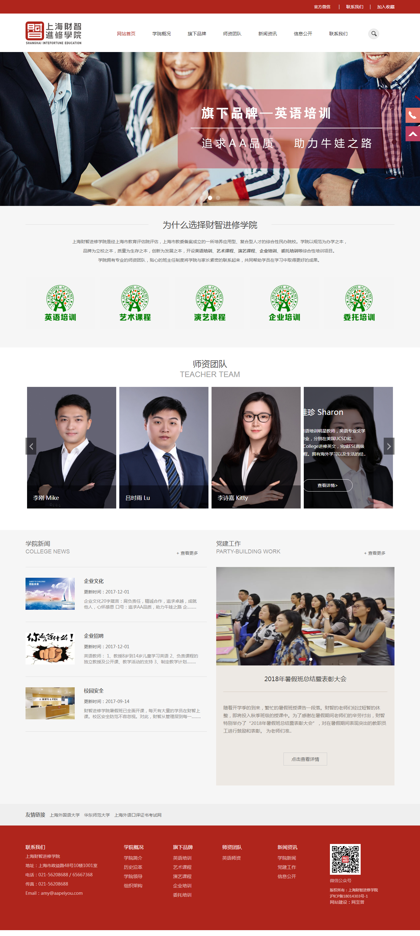上海財智進(jìn)修學(xué)院是經(jīng)上海市教育評估院評估,上海市教委備案成立的一所培養(yǎng)應(yīng)用型、復(fù)合型人才的綜合性民辦院校。學(xué)院以規(guī)范為辦學(xué)之本,品牌為立校之本,質(zhì)量為生存之本,創(chuàng)新為發(fā)展之本,開設(shè)英語培訓(xùn)、藝術(shù)課程、演藝課程、企業(yè)培訓(xùn)、委托培訓(xùn)等綜合性培訓(xùn)項目。學(xué)院擁有專業(yè)的師資團(tuán)隊,貼心的班主任制度將學(xué)院與家長緊密的聯(lián)系起來,共同幫助學(xué)員在學(xué)習(xí)中取得更好的成果。